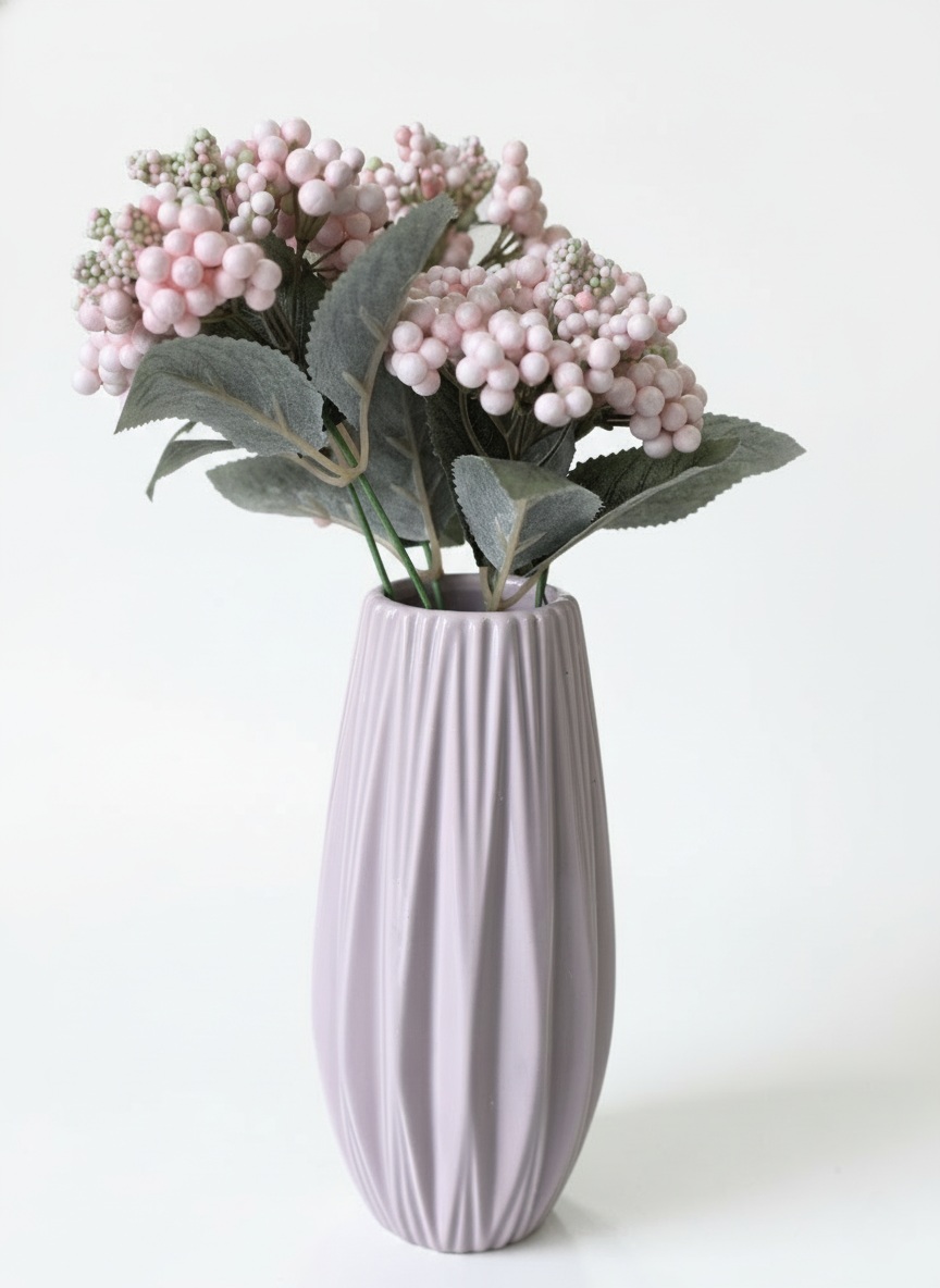 Эта элегантная ваза высотой 21 см отличается нежно-сиреневым оттенком и уникальной текстурной поверхностью с вертикальными складками, создающими эффект гофрирования. Она станет прекрасным дополнением к любому интерьеру, добавив нотку изысканности и современности. Идеально подходит для небольших букетов или как самостоятельный декоративный элемент.