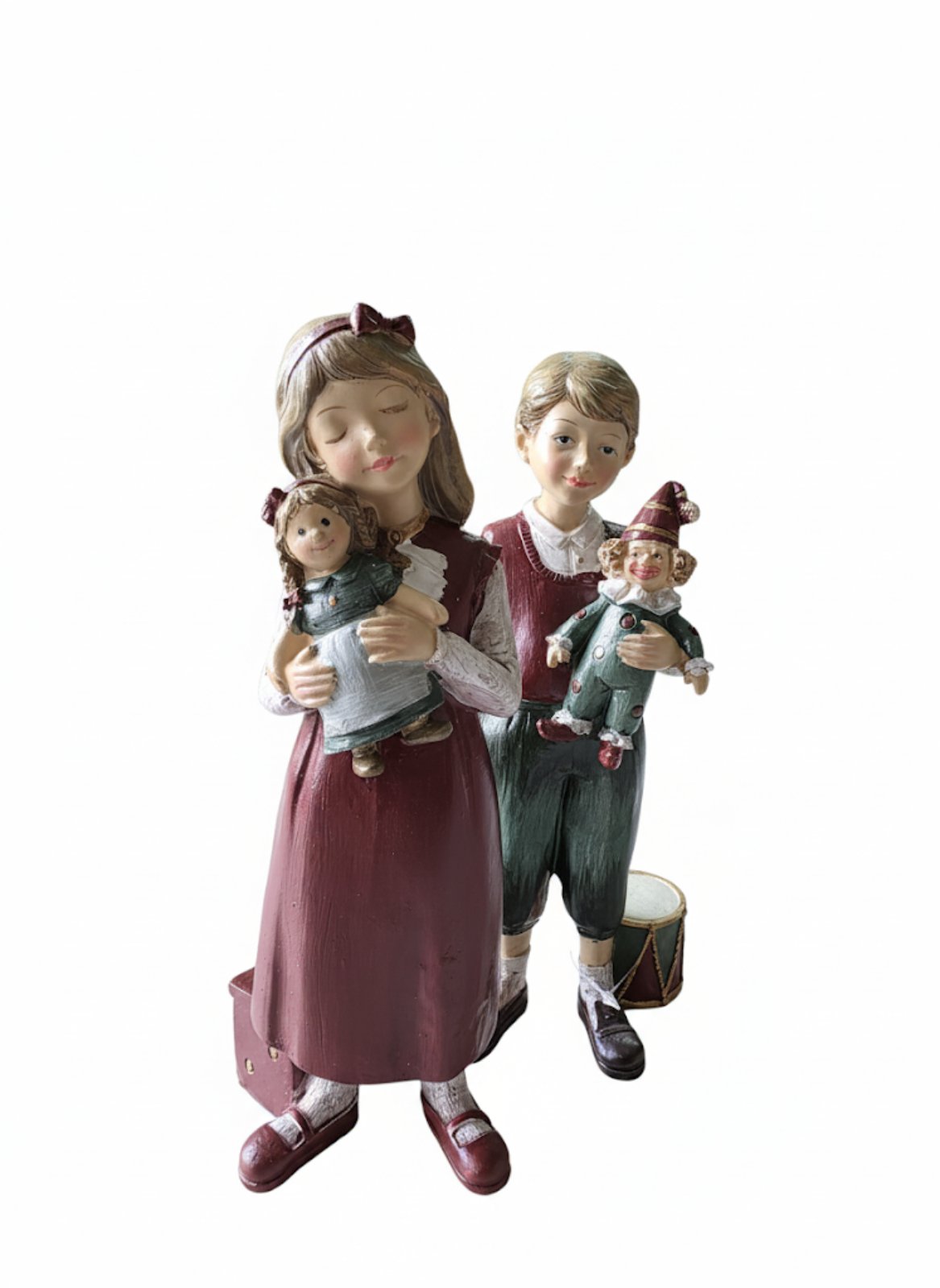 Милая фигурка изображает девочку, нежно прижимающую к себе куклу, словно шепча ей свою тайну или просто наслаждаясь моментом покоя. Ее глаза прикрыты, на лице застыло умиротворение и тепло. На ней бордовое платье и белая блузка, а в волосах — небольшой бант в тон платью. Фигурка высотой 21 см, выполнена в теплых, приглушенных тонах, что придает ей винтажный и ностальгический вид. Она излучает нежность и детскую невинность, становясь трогательным напоминанием о самых искренних чувствах.