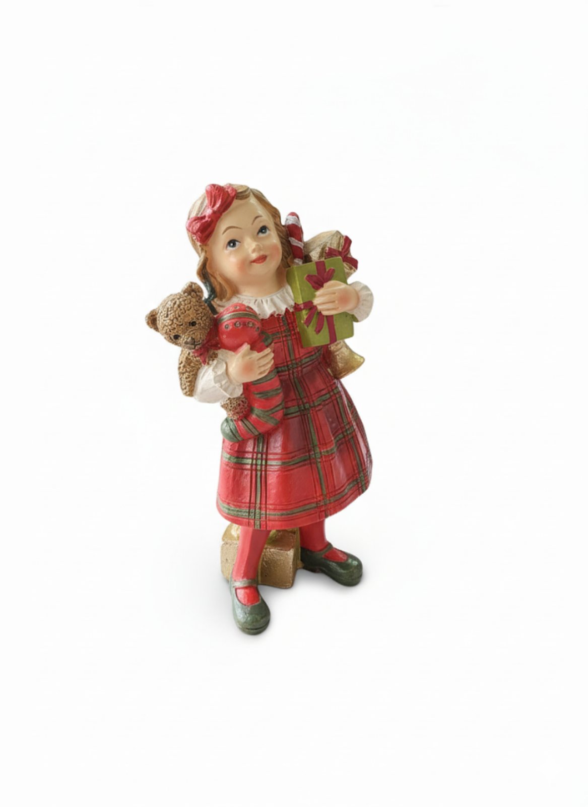 Одета в очаровательное красно-зеленое платье в шотландскую клетку с белым воротничком и красным беретом. В руках она держит множество подарков, колокольчик и плюшевого мишку. Фигурка стоит на постаменте из подарков.