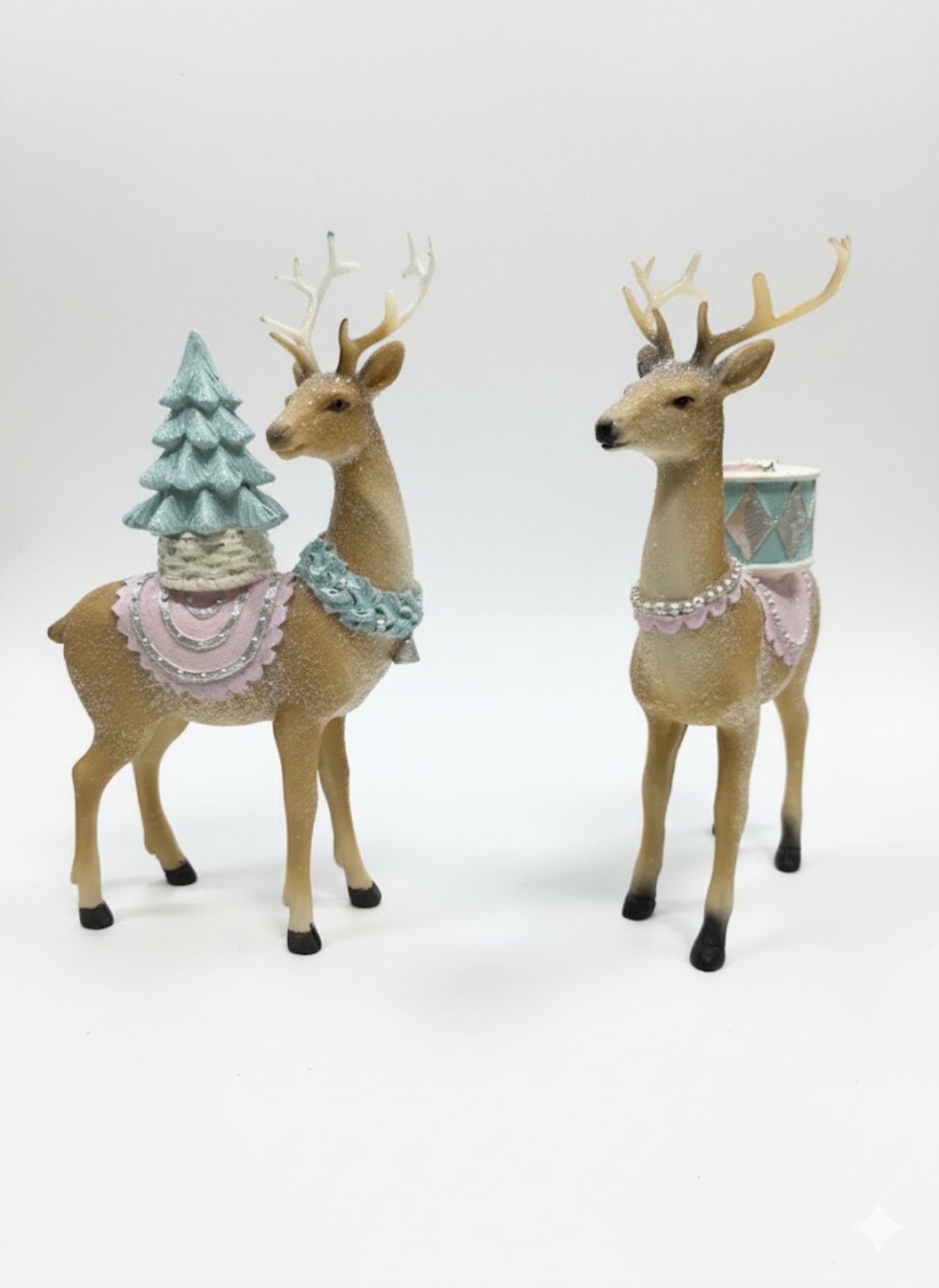 Ця художня прикраса у вигляді оленя — справжній витвір мистецтва, що здатний наповнити казковою атмосферою та затишком будь-який інтер'єр. Ця витончена фігурка, заввишки 21 см, з першого погляду заворожує своєю деталізацією та вишуканим дизайном. Олень, що несе на спині засніжену ялинку, ніби зійшов зі сторінок різдвяної казки. Ніжні роги, витончений бірюзовий вінок з бубонцями та рожево-срібляста попона з мерехтливими блискітками — усе це створює відчуття чарівності та свята.
