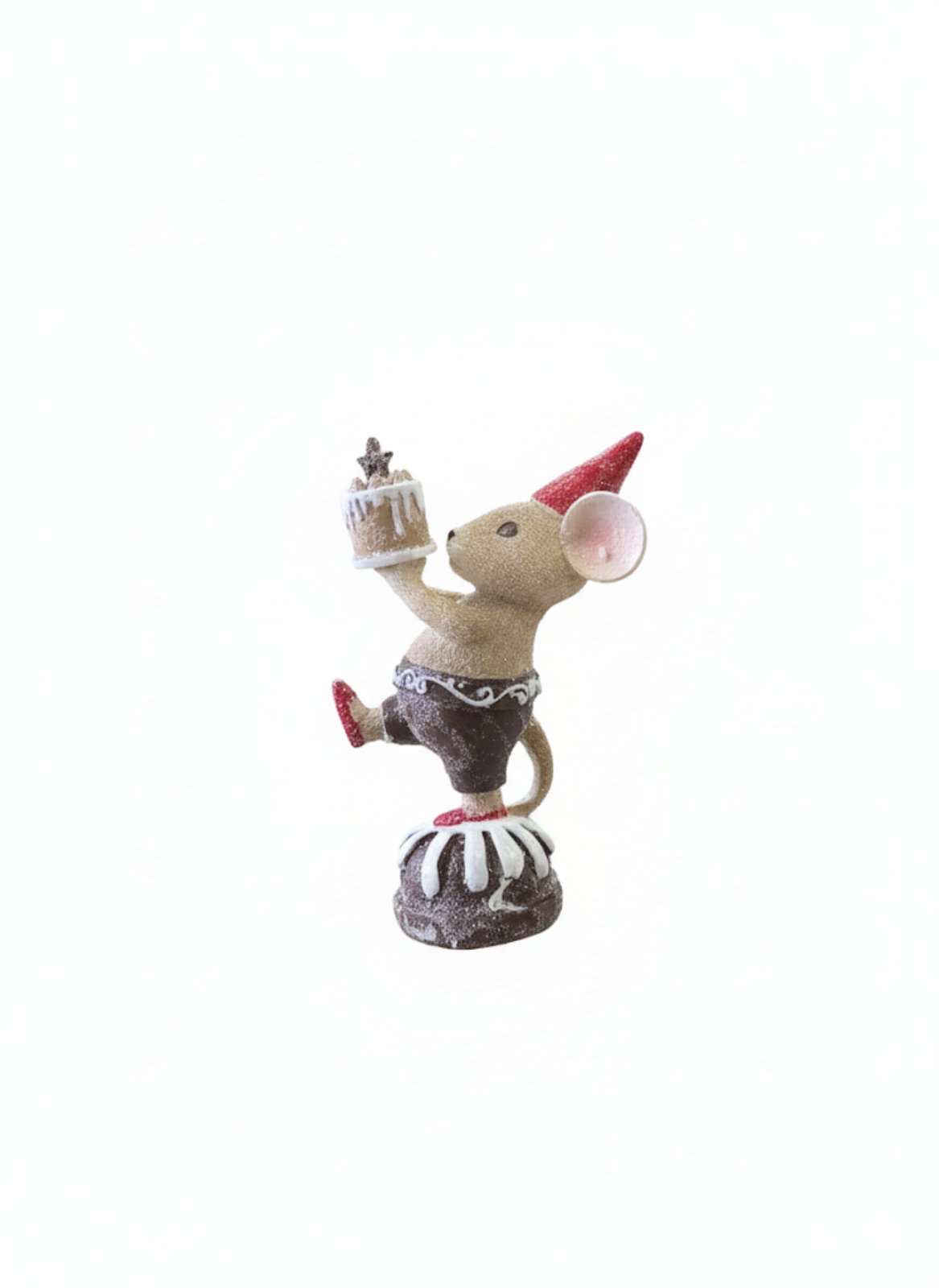 Їхні фігурки вкриті іскристим глітером, який мерехтить, як сніг у місячному світлі, надаючи їм казкового вигляду. Мишки вбрані у вишукані костюми: деякі — в милі спіднички, прикрашені сердечками та візерунками, інші — у святкові шортики. На головах у кожної — ковпачок з білосніжним пензликом, що підкреслює їхній урочистий образ. У лапках вони тримають апетитні кекси, вкриті білою глазур'ю, або навіть багатоярусний торт, створюючи атмосферу затишку і солодких моментів.